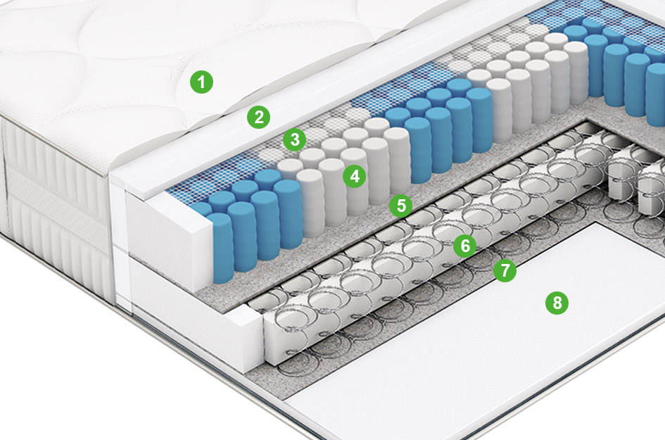 Блок независимых пружин с 7 зонами поддержки спящего принесёт истинное наслаждение от сна для тех, кому важен выраженный ортопедический эффект. Точечная эластичность блока усилена благодаря наличию 7 зон жёсткости, равномерно распределенных по всей длине матраса. Диаметр пружины 60 мм, высота 140 мм.