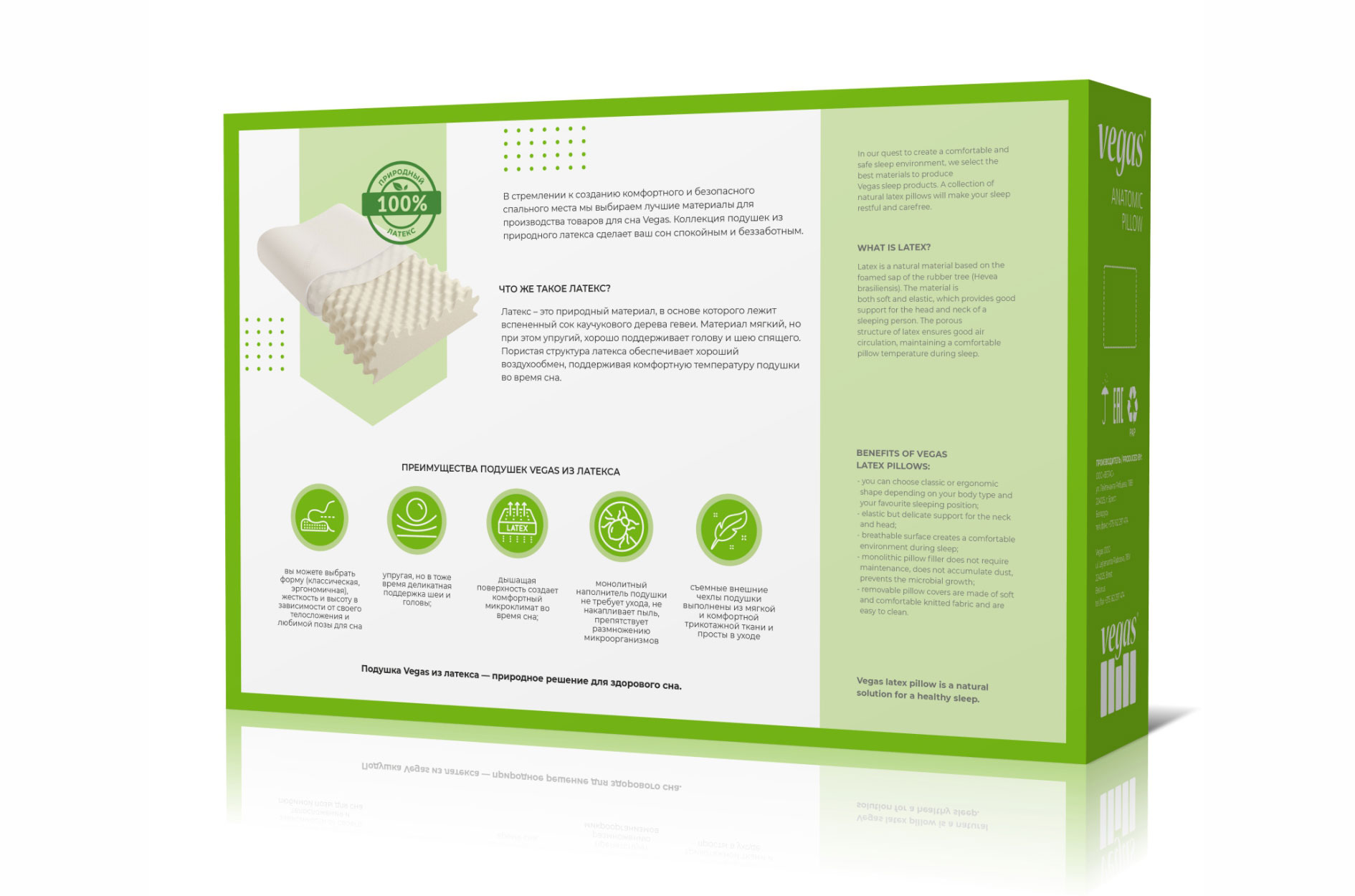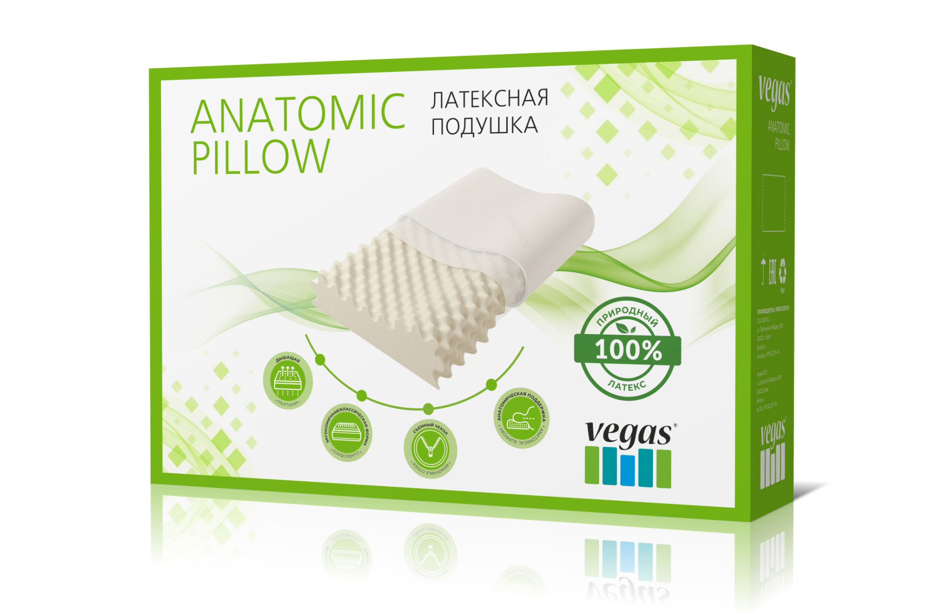 Подушка из природного латекса с приятным массажным эффектом, который достигается благодаря рельефной поверхности. Валики разной высоты позволяют использовать ее независимо от положения во сне.